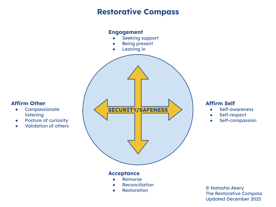 Language matters in restorative work. In the current version of the Restorative Compass, the term “affirm” is used in place of “acknowledge,” thanks to the careful consideration of my colleague Sandy Ruch-Morrin. Affirmation moves beyond recognition toward validation, dignity, and a sense of belonging. Also in this current version, the term “safeness” is used in place of “safety,” for which I am grateful to Dr. Frida Rundell. Safeness recognizes that being physically safe does not guarantee that someone is emotionally and psychologically safe. The update clarifies the ethical and relational posture the compass is intended to support. The Restorative Compass is a living framework and may continue to evolve as practice and reflection deepen.